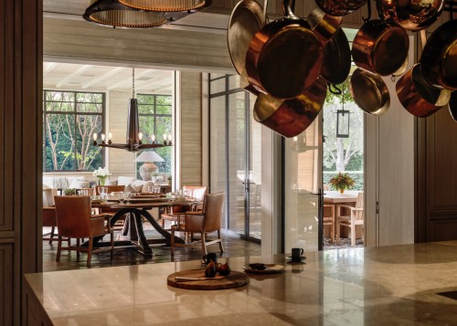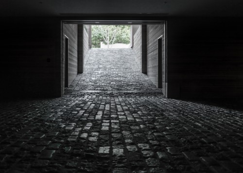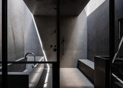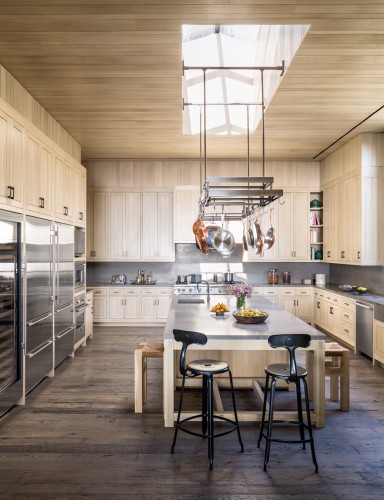 Elemental, raw and monastic in its rigor, this linear house overlooks the Pacific and is concealed by a bluff from the busy coast highway. Mitchell “wanted people to feel that we had come with a surgeon’s scalpel and inserted the mass into the land.” Board-formed concrete, wood and glass are used consistently throughout, and steel beams embedded in the roof plane support the weight of plantings over long spans while bracing the piers. The central axis extends 250 feet from the garage at the east end to the master suite at the west, bringing a spatial drama to the succession of rooms, all of which are bathed in ocean light. The south front is shaded by a projecting roof plane that is clad in bleached cedar wood, matching the tone of the ceilings. Pavers step down the slope to an infinity pool, which provides a visual link to the ocean far below.